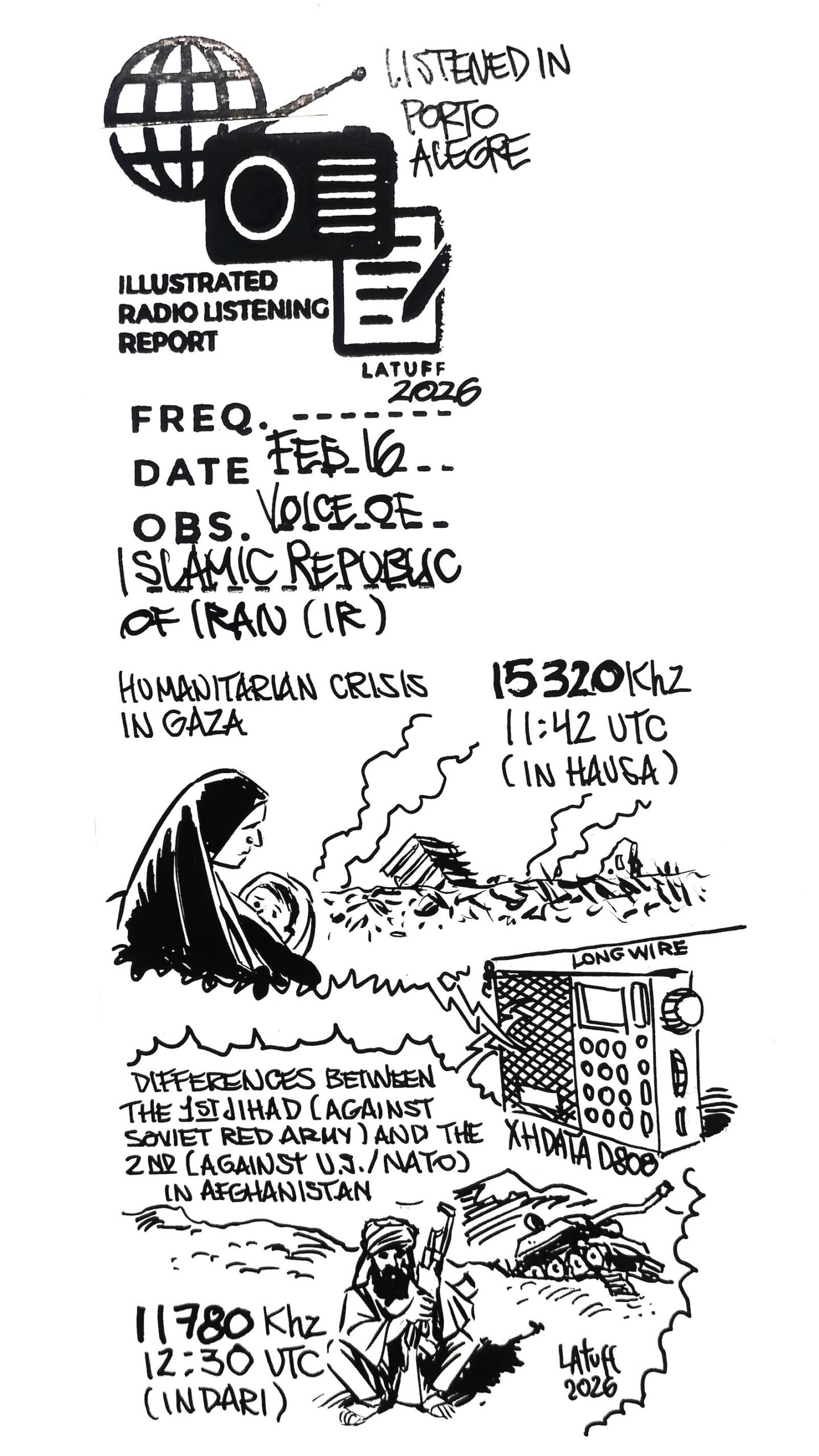 Many thanks to SWLing Post contributor and noted political cartoonist, Carlos Latuff, who shares the following illustrated radio listening report of a recent Voice of Islamic Republic of Iran broadcast.