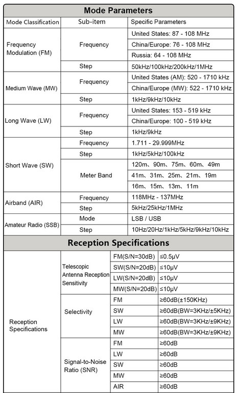 ABC settings include AGC limit, AGC gain, and manual control, all settable in dB.  On a third page of options, we find NB Mode, NB Threshold, Equalizer Type, Key Beep Level, and SQUELCH Threshold.  Recording is accomplished with a direct access button (NOTE:  I had some problems getting record to work and it remains to be seen if this is a microSD issue or an indication of some other problem).  A quite nice printed manual shows the modes: USB, LSB, CW, DSB, AM, SAM, NFM, WFM.  Steps are listed as:  100 Hz, 500 Hz, 1 kHz, 2.5 kHz, 5 kHz, 6.2 kHz, 8.3 kHz, 9 kHz, and 10 kHz.