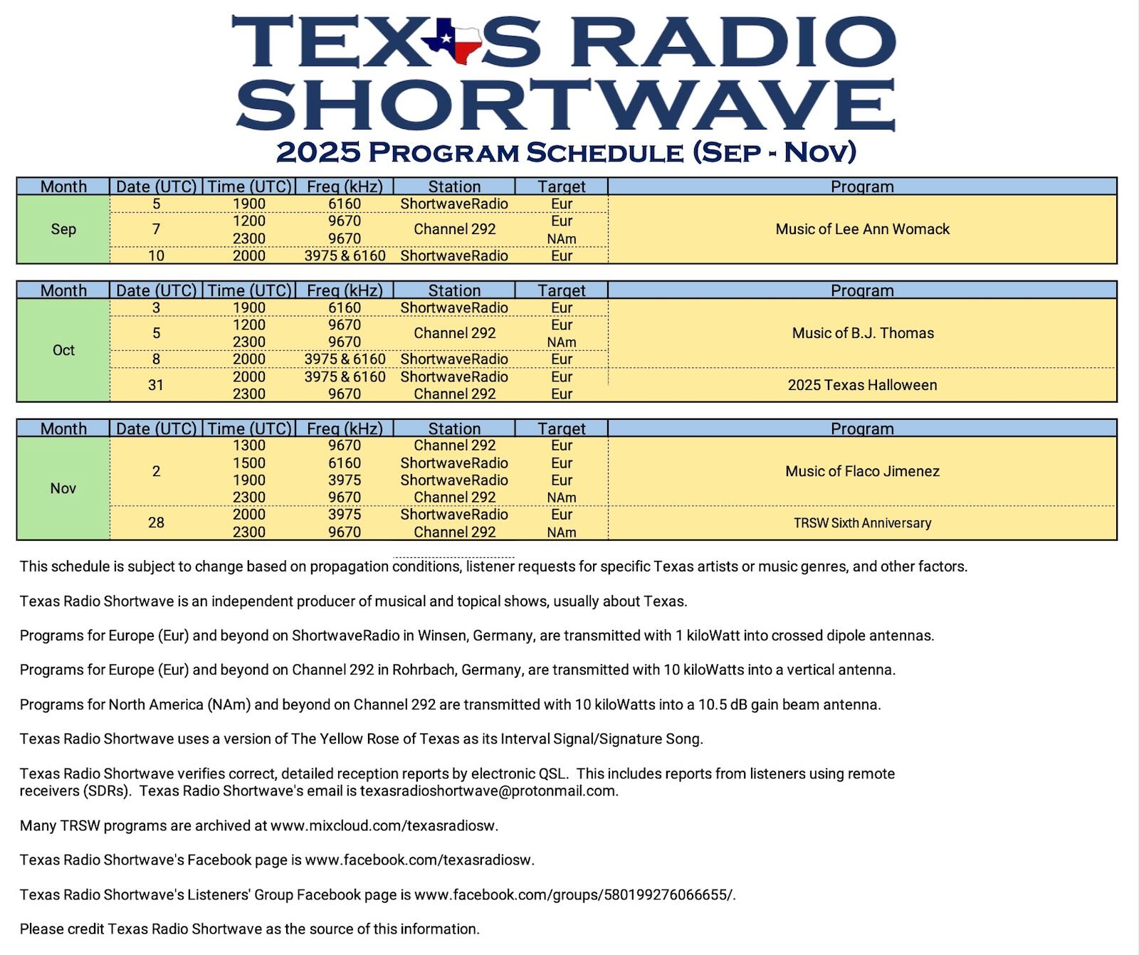 Texas Radio Shortwave: Schedule for September – November 2025 Leave a reply Many thanks to SWLing Post contributor Terry (N5RTC), who shares the following schedules for Texas Radio Shortwave (click image to enlarge): Related