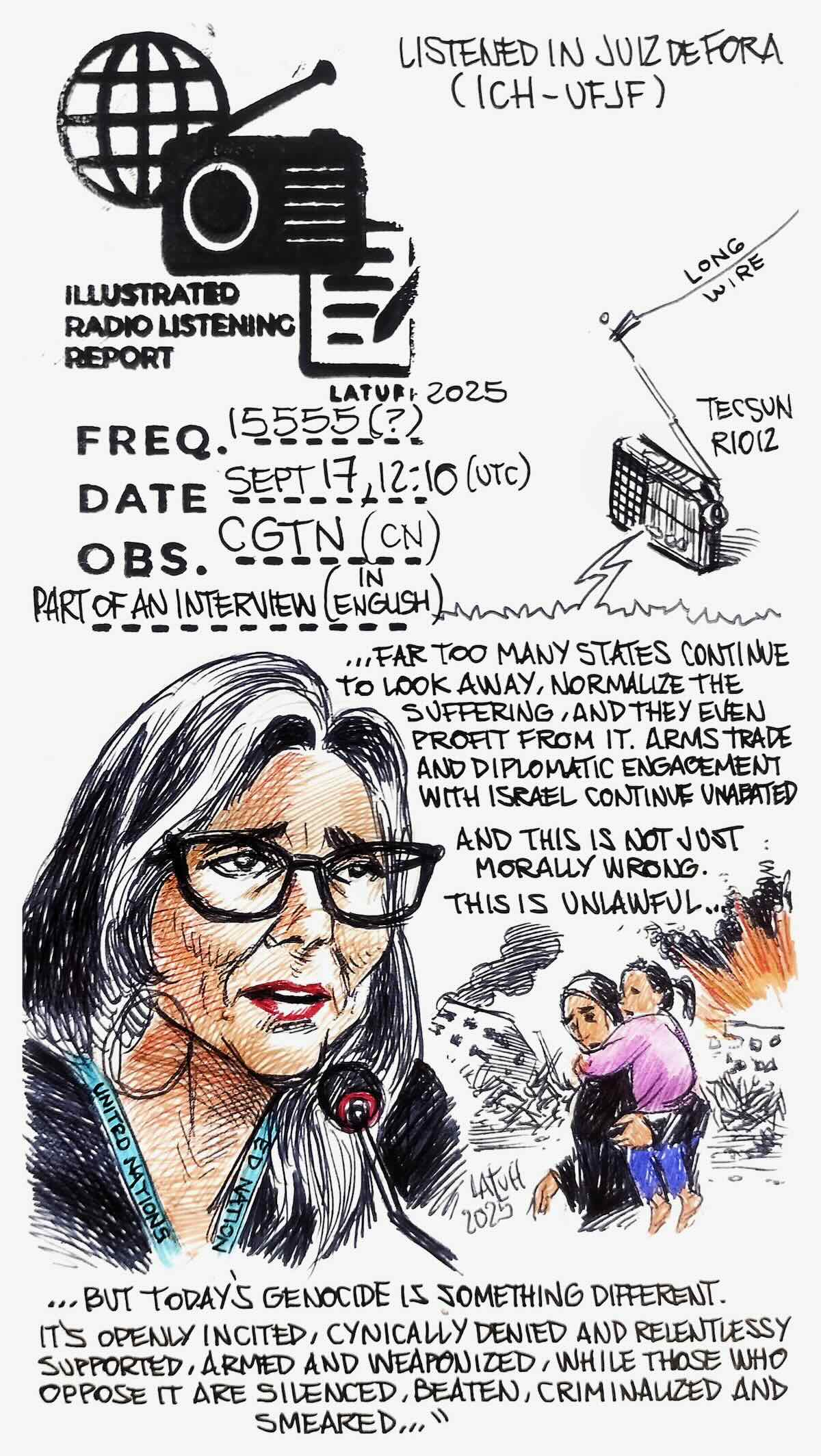 Many thanks to SWLing Post contributor and noted political cartoonist, Carlos Latuff, who shares the following illustrated radio listening report of a recent CGTN broadcast.