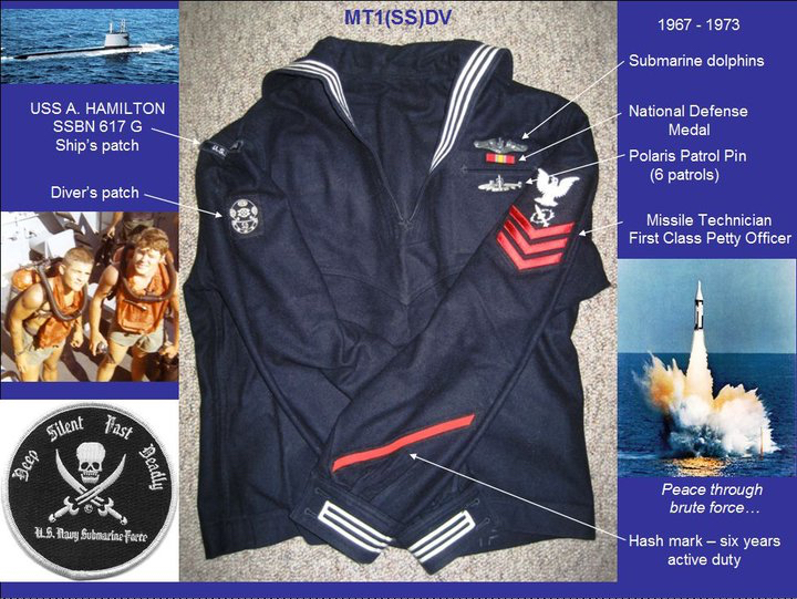 I was an MT1(SS)DV, and here is the uniform I wore. I am on the right in the photo of the two divers and with my swim buddy at the US Navy Diver School in Key West, FL (1970), who was a Recon Marine.