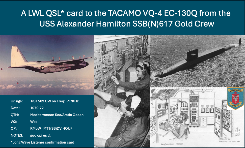 Of course we maintained radio silence during patrols but we could copy VLF when we put out our long trailing floating wire antenna when we were near but below the surface. We could then pick up the transmissions from the TACAMO EC-130Q’s flying in very tight circular patterns just above stall speed with a 5-mile long wire trailing behind them which circled down in a helical form just above the sea somewhere out in the Atlantic.