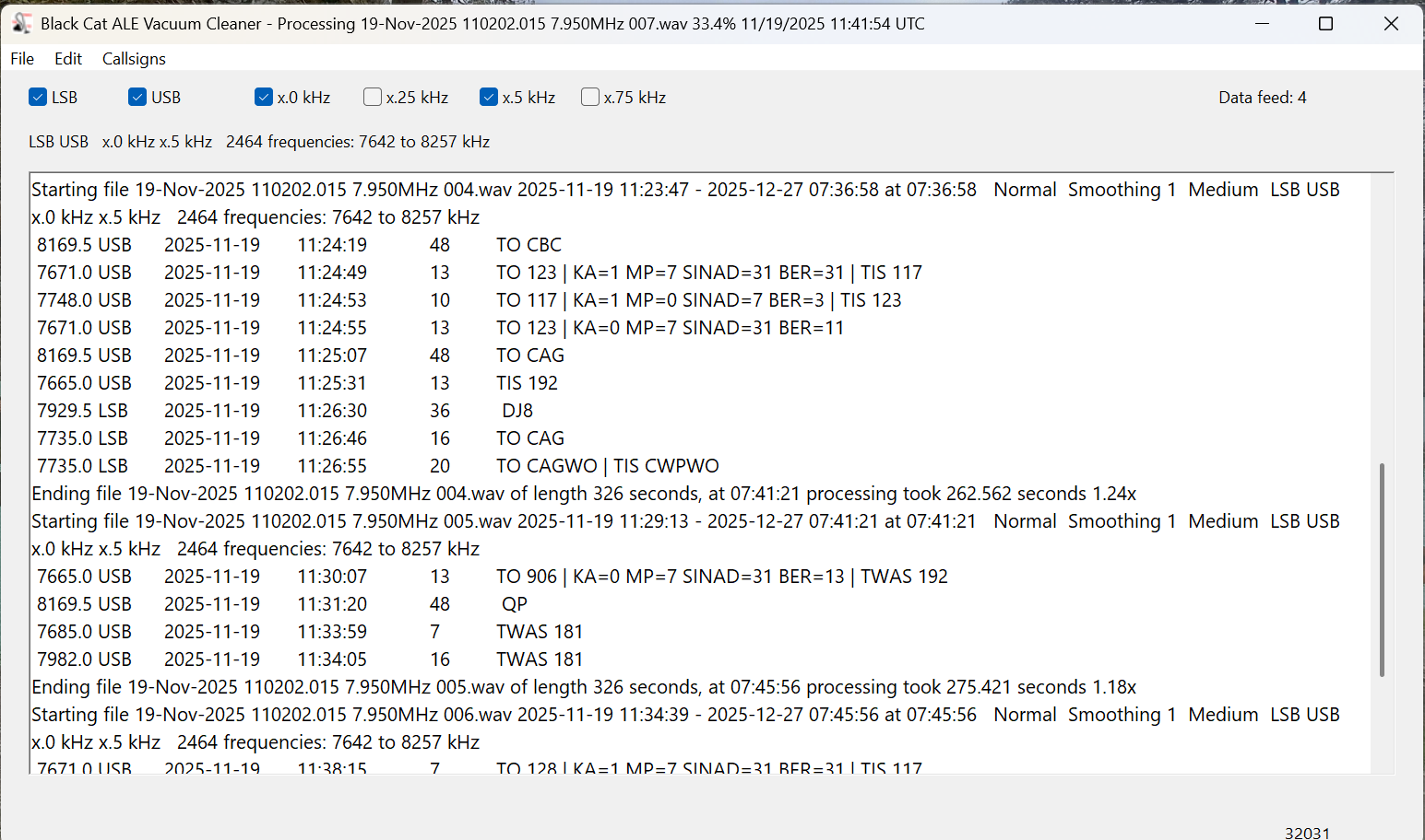 The current settings and the frequencies being scanned are displayed at the top, under the settings checkboxes. There are actually only 1232 distinct frequencies in that range, but the number is doubled as each one is being checked in both LSB and USB. Below that, the output window lists each file as it is being scanned and ALE logs as they are found. (But be sure you are also recording these to a text file.)