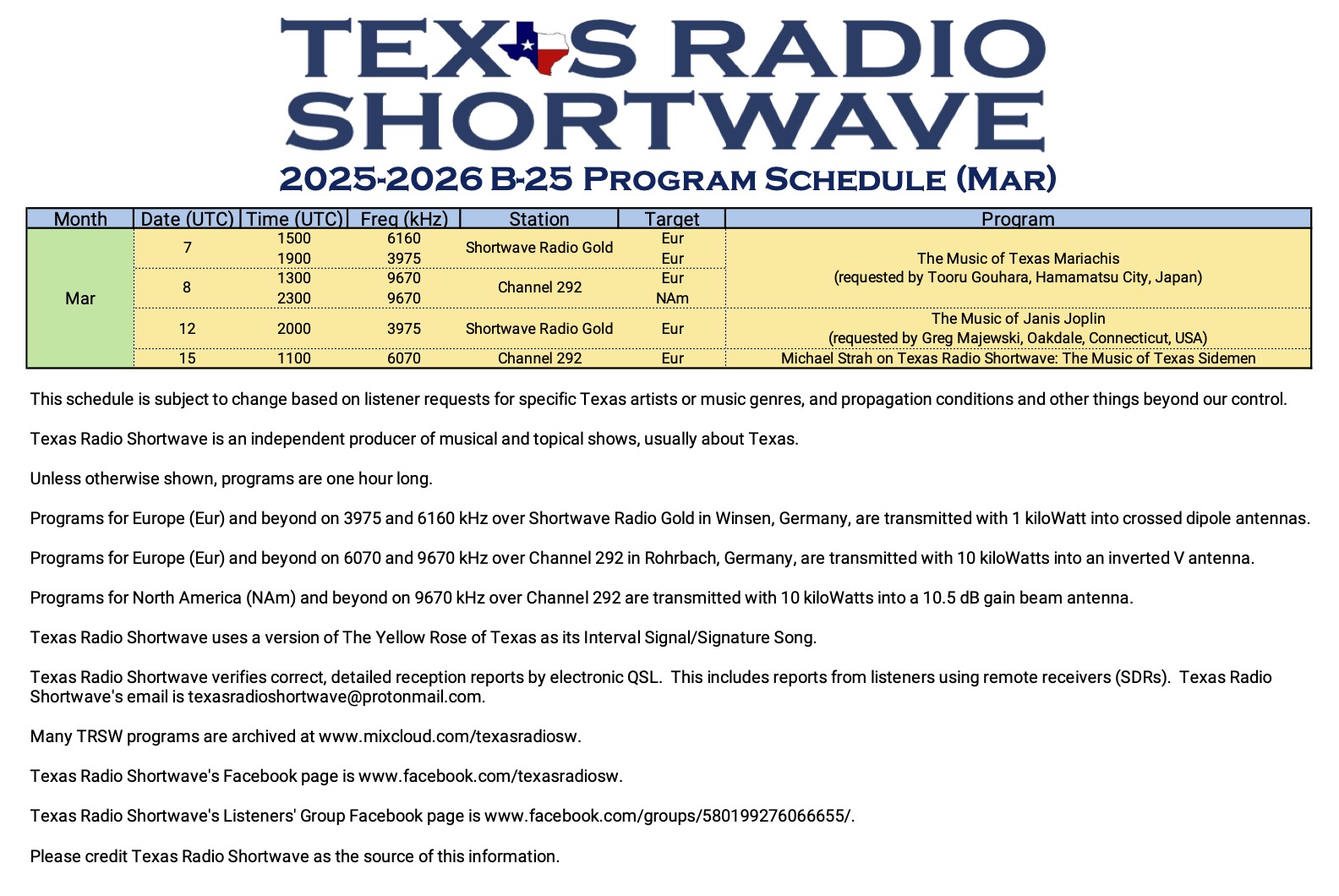 Texas Radio Shortwave: Schedule for March 2025 Leave a reply Many thanks to SWLing Post contributor Terry (N5RTC), who shares the following schedules for Texas Radio Shortwave (click image to enlarge): Related