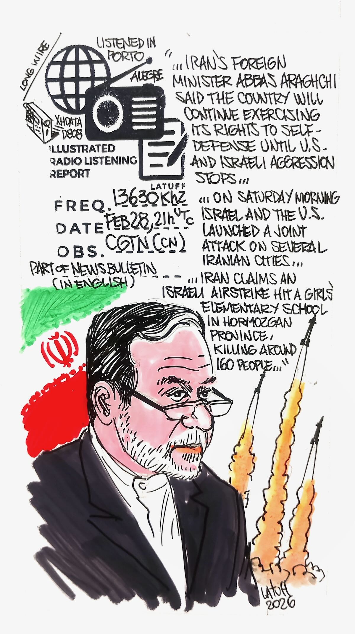 Many thanks to SWLing Post contributor and noted political cartoonist, Carlos Latuff, who shares the following illustrated radio listening report of a recent CGTN broadcast.