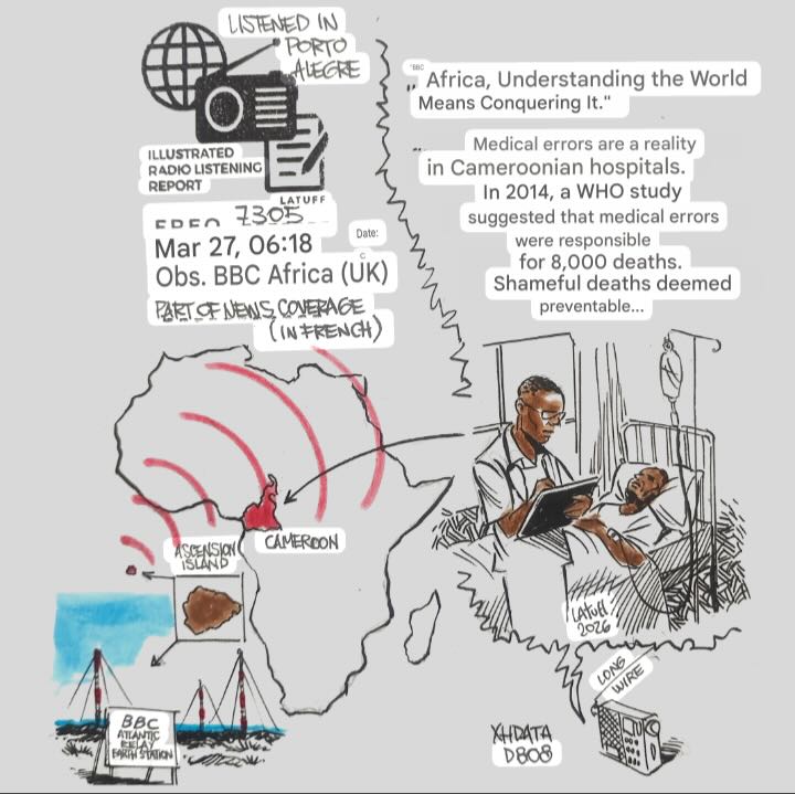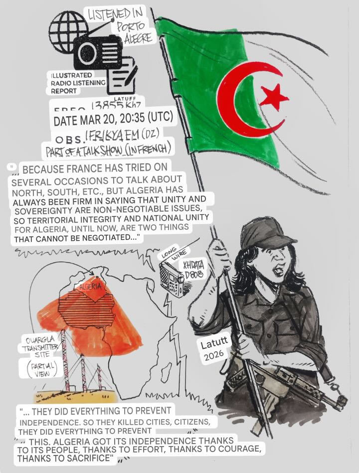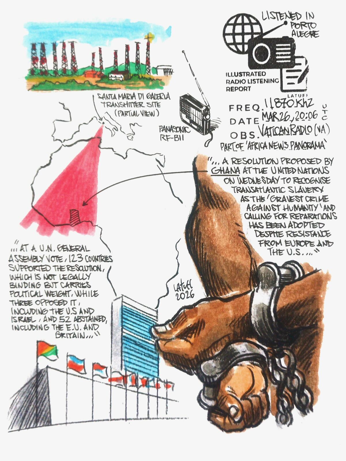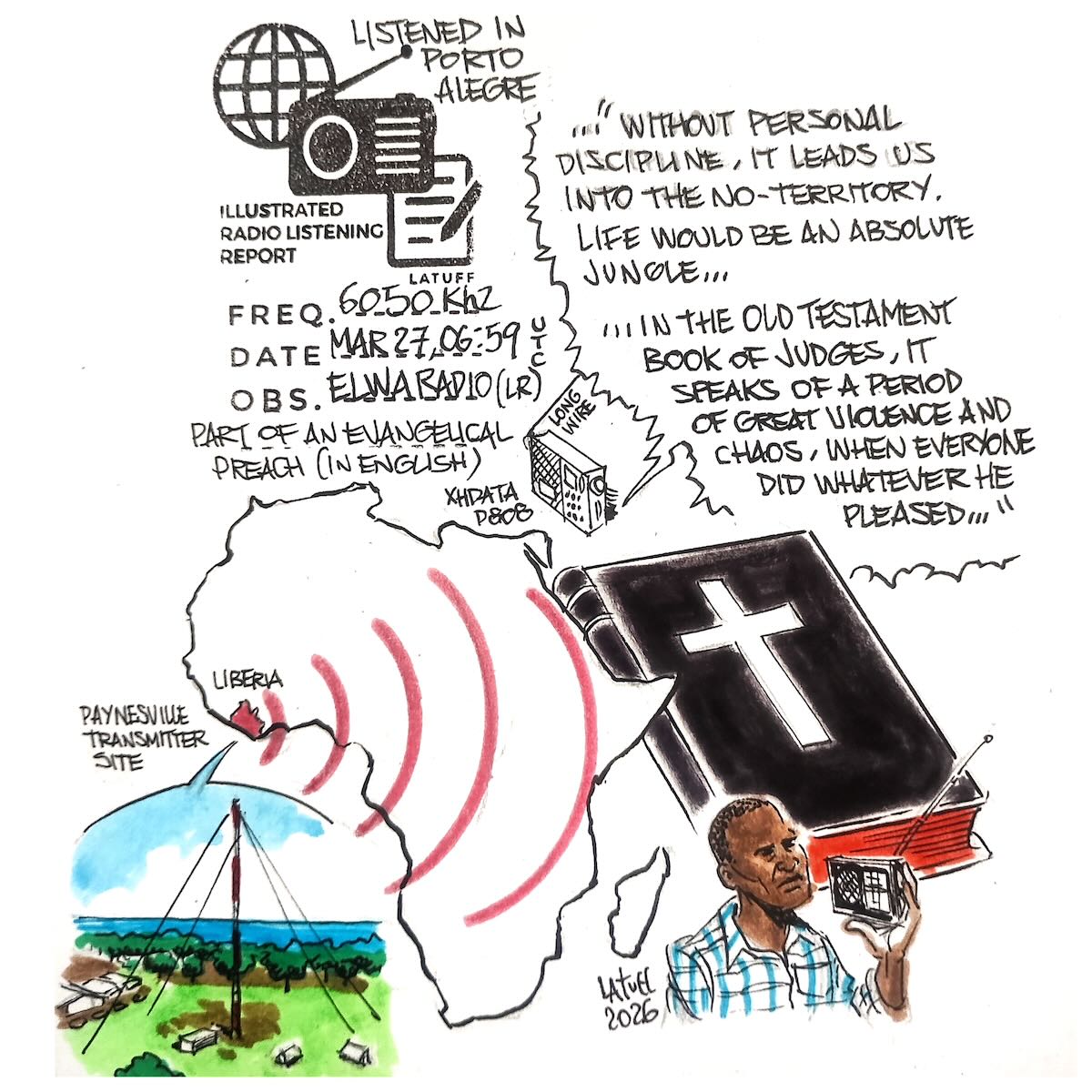 Many thanks to SWLing Post contributor and noted political cartoonist, Carlos Latuff, who shares the following illustrated radio listening report, Special Edition: Africa.