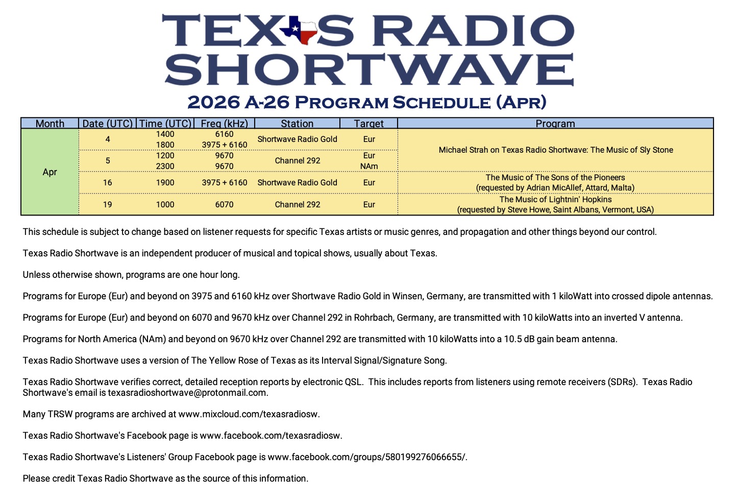 Texas Radio Shortwave: Schedule for April 2026 Leave a reply Many thanks to SWLing Post contributor Terry (N5RTC), who shares the following schedule for Texas Radio Shortwave (click image to enlarge): Related