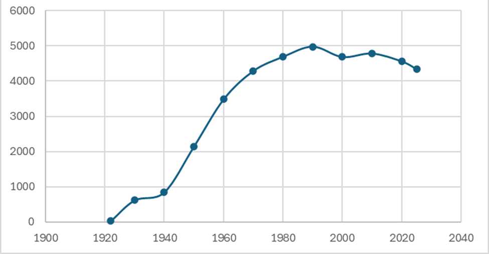I have recently wondered whether shortwave use has contracted about as far as it can go. This is not the case with AM, at least not yet. The graph below shows the total number of AM radio stations in the US throughout history, 100 years. The total has remained relatively stable since 1960, albeit with a slight downward trend from the peak around 1990. Stations occasionally come and go. Some rebrand with a different format or fresh call letters. Note that the steepest rate of decline, 217 stations, occurred over the past five years, amounting to 4.7%. Whether this rate of attrition will continue is a matter of speculation.