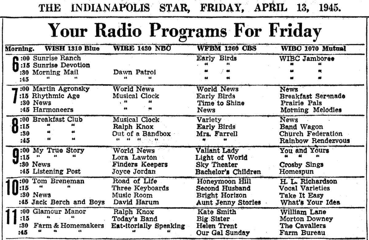 Newspapers published daily tabular program schedules for all the local stations. My dear mother would carefully trim these out of the paper and clip them together for a complete week’s program listing. You can see below some of WFBM’s soap operas started as early as 9:00 am. Don McNiell’s Breakfast Club (WISH, 8:00 am) “coming to you from high atop the Hotel Allerton in downtown Chicago” was a great syndicated live variety show.