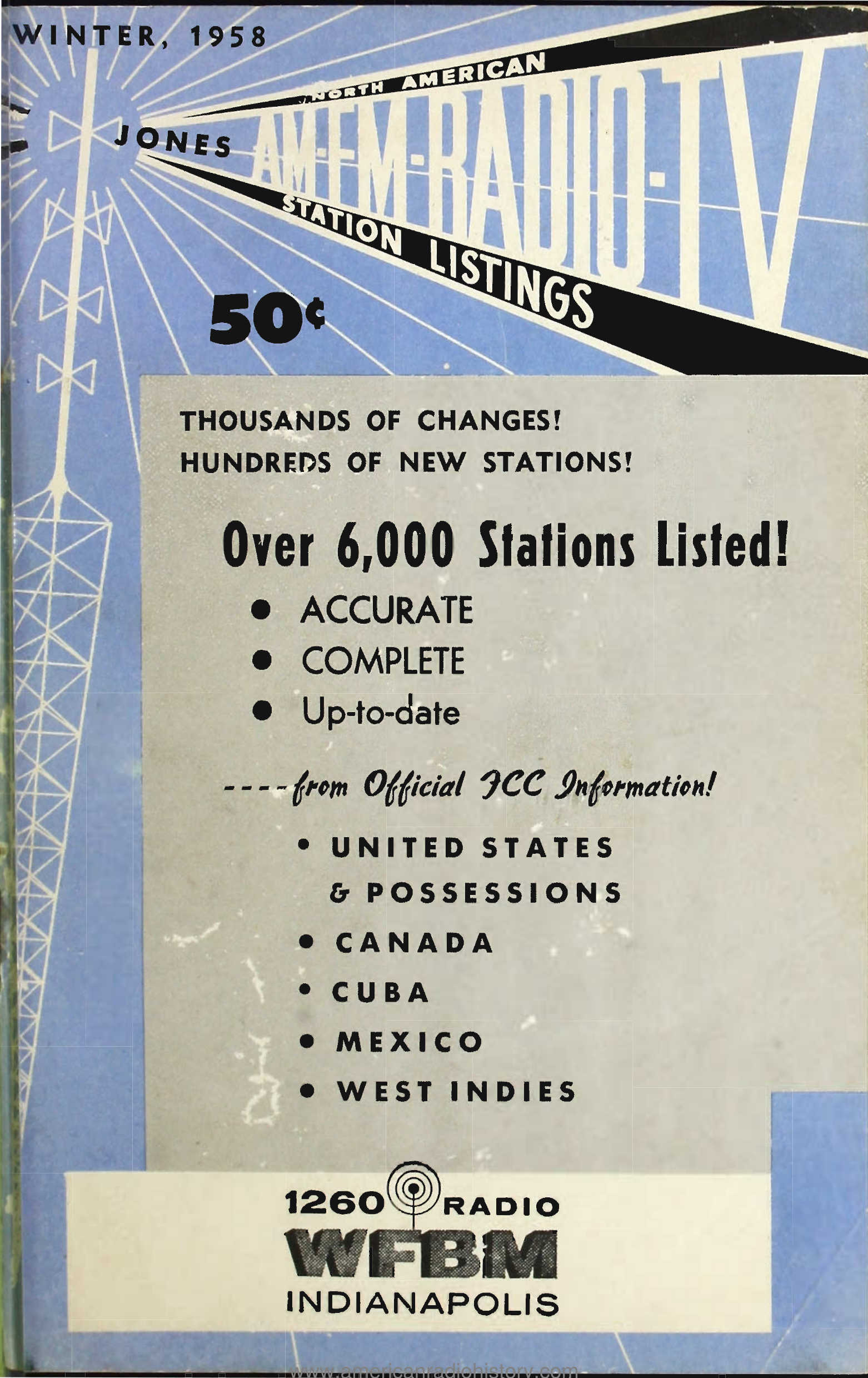 Just as with shortwave, it is very useful to have some resources to help identify stations. The year was 1958 BC (before computers). There were no online portals for station information. Printed information, what there was of it, was generally spotty and dated. There was one man, however, whose passion for radio and TV of the time led him to manually and painstakingly develop a database of radio and TV stations, their locations, and their frequency or channel. His name was Vane A. Jones. He was a real estate broker by trade, and his office was coincidentally right down the street from where I lived in Indianapolis. Although I never met him, his dedication to producing his station guide is a marvel of work that has amazed me over many years. His North American AM-FM Radio TV Station Listings was self-published in 1958, and picked up by Howard Sams Publishers in 1963, where it continued to be revised periodically through 1981. See https://www.worldradiohistory.com/Archive-All-Logs-Lists-Directories/Jones_Master_Page.htm. This is the book I started with and still have as a keepsake.