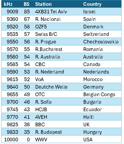 As an example, I located some notes made in 1959 using the S-38E. The table shows the frequency, bandspread reading, station and country. Thirty-one meters was an easy match for the bandspread, as WWV on 10000 kHz was a steady marker which you could use to calibrate the bandspread with the main tuning. For all practical purposes, the band was bounded by the Voice of Spain on 9360 kHz and R. Budapest on 9833 kHz. For many years, Tel Aviv was an outlier on 9009 kHz.