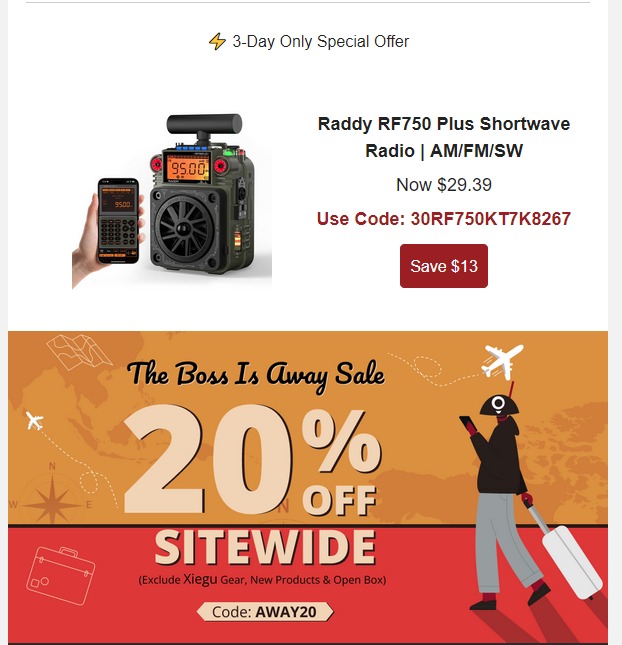 This was emailed out today, so I thought I would post it here for those not on the Radioddity mailing list. Note that in addition to the special code for the RF750 Plus, there is a 20% off site wide code with some exclusions: