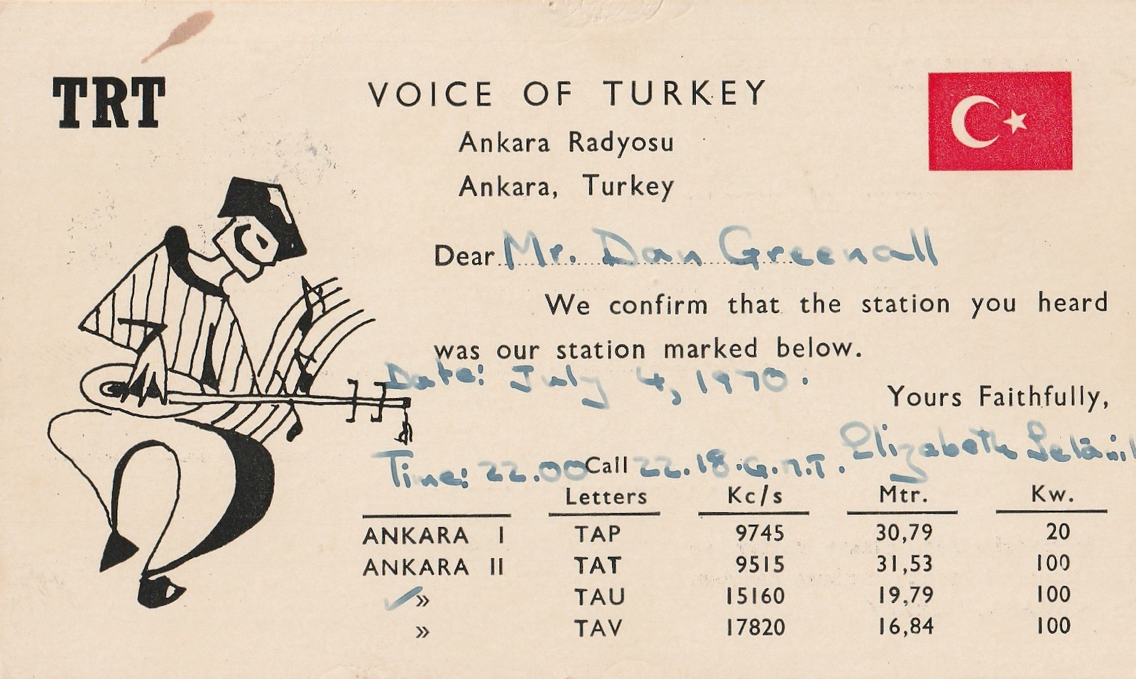The high powered transmitters in Turkey and programming in a variety of languages provide worldwide listeners a great opportunity to tune into this part of the world. A musical interlude accompanied by frequent identifications precedes their transmission. This recording was made on July 31, 2025 at 0254 UTC leading up to 0300 sign on in English on 7275 kHz. Reception was made using a remote SDR in the UK:
