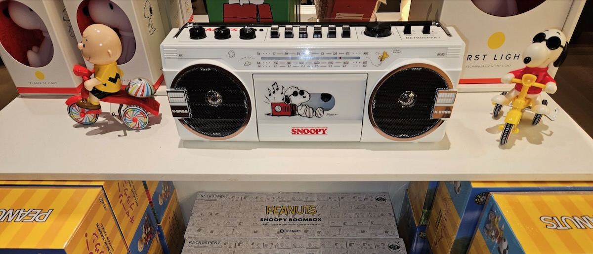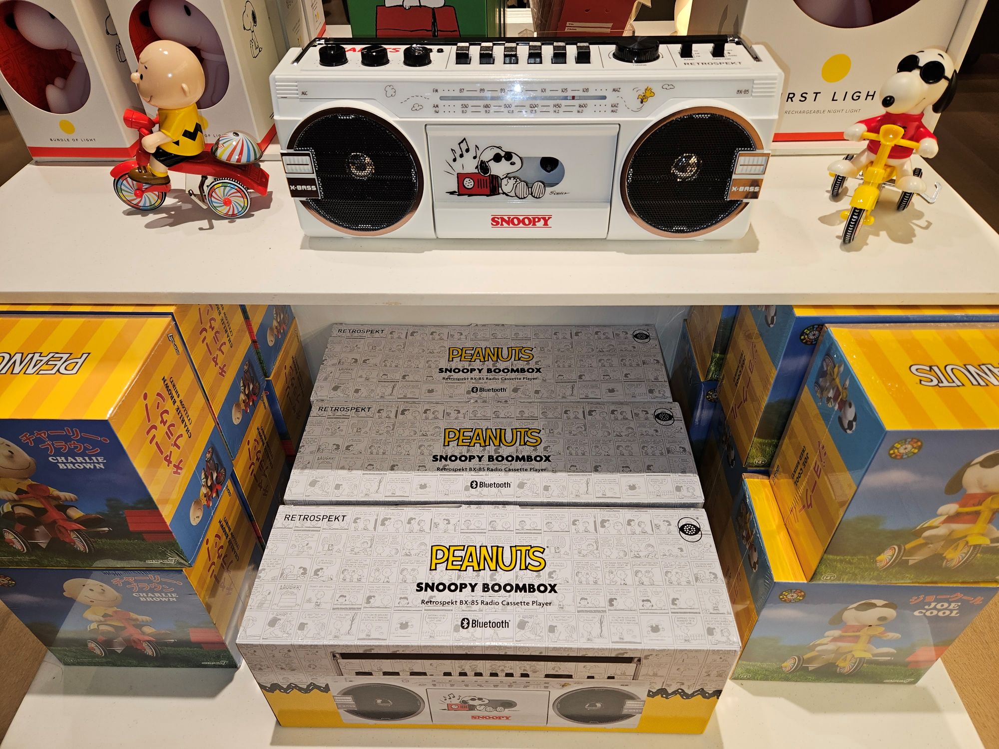 On a recent visit to the New York Museum of Modern Art (MOMA), in the kids section of the Design Store, I spotted a retro boombox with AM, FM, and SW bands. MOMA sells the Snoopy-themed BX-85 Bluetooth Cassette Player Boombox, by Retrospekt, for $99 to non-members.