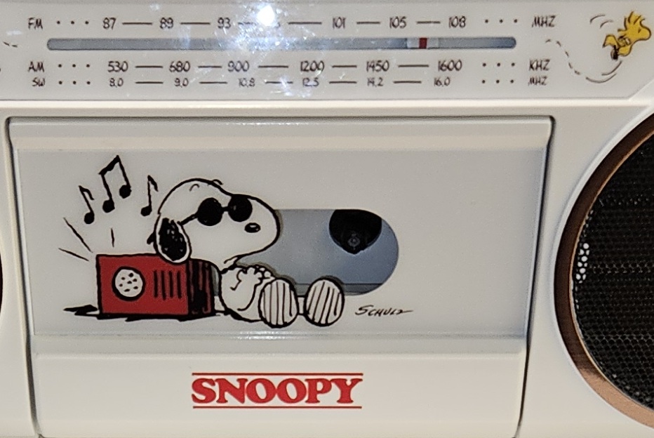 The cassette player’s door has a drawing of our favorite beagle Snoopy in his Joe Cool persona listening to a radio. Peanuts creator Charles Shulz drew a strip published on July 12, 1981, that has Snoopy listening to a “bark” show (sic) on a tabletop radio. We don’t know the coverage of that comic strip radio.