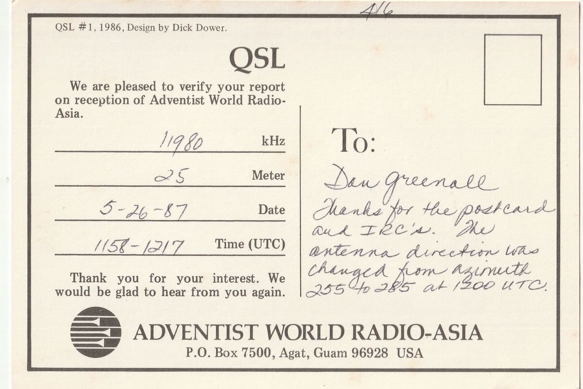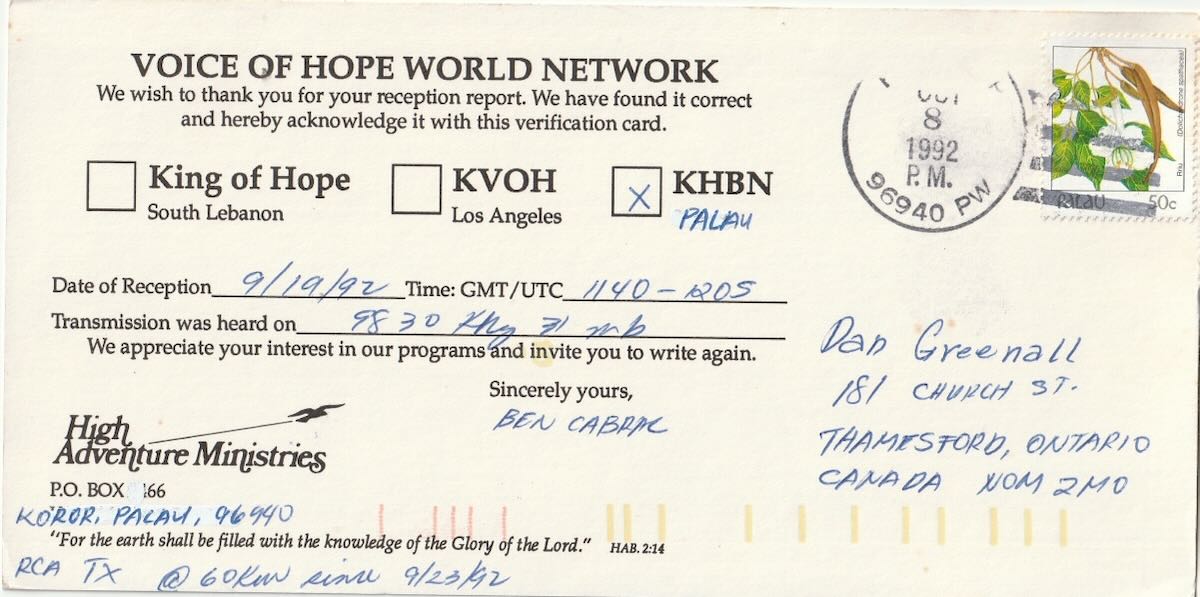 Back in the 1950s, the Voice of America had a transmitter in Honolulu, but that was long before my introduction to shortwave. In 1993, World Harvest Radio station KWHR began broadcasting from Naalehu, near the southern tip of the big island of Hawaii. This one was widely heard by DXer’s and I still have a recording made of their announcement from November 10, 1996 on 9930 kHz.