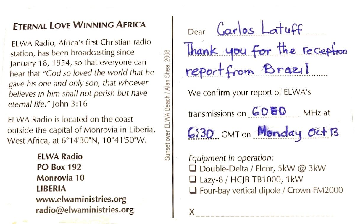 Carlos’ Illustrated Radio Listening Report, QSL, and Recording of Radio ELWA (October 14, 2025)