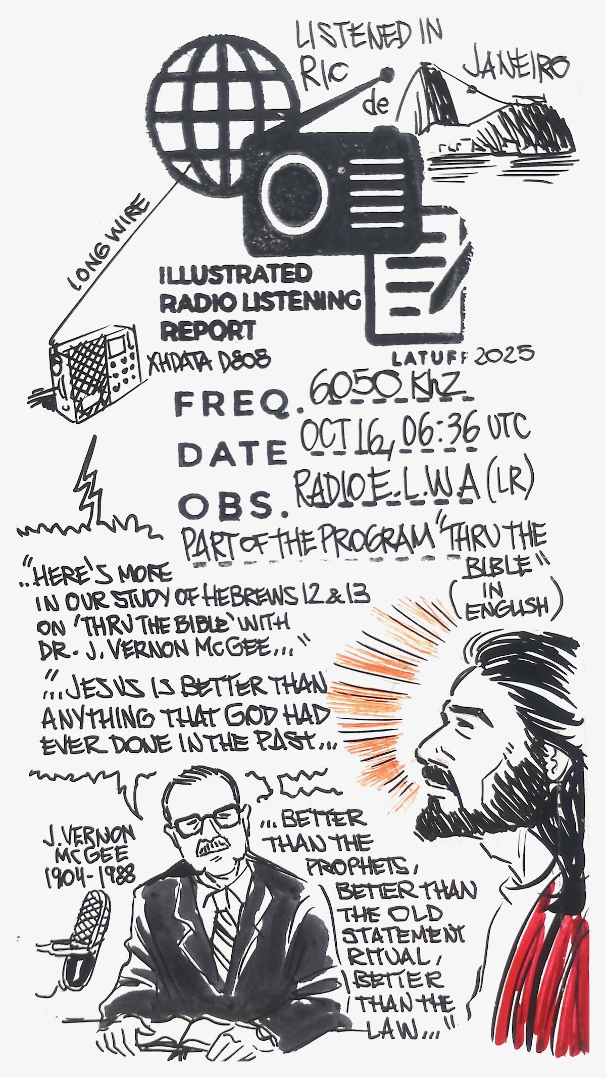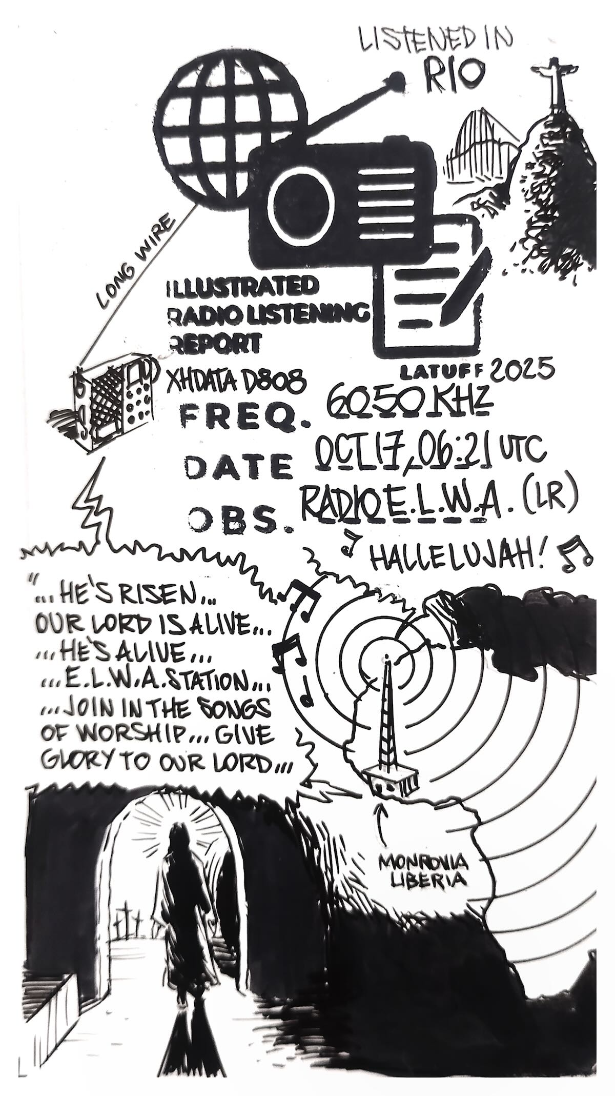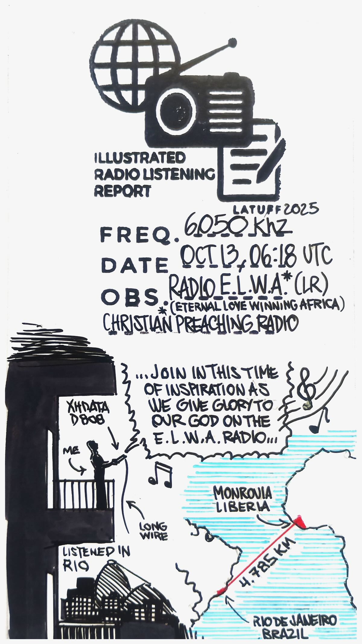 It’s never been easy for me to pick up the ELWA (Eternal Love Winning Africa) radio signal on 6050 kHz in Brazil. The signal was always weak, propagation was poor, and conditions were never particularly favorable for listening to the historic evangelical radio station from Monrovia, the capital of Liberia. Until then, I had only listened ELWA, with great difficulty, in Porto Alegre and Guaíba, both cities in Rio Grande do Sul, and in Juiz de Fora, Minas Gerais. Recently, while scanning shortwave frequencies during the early morning hours in Rio de Janeiro, I received the ELWA radio signal and decided to try recording the broadcast. I noticed a sort of propagation window between 6:30 and 6:50 (UTC). Even though, it took at least six days of failed attempts, the same weak signal and poor propagation, until finally today, October 13th, I got clear audio.
