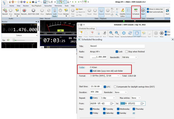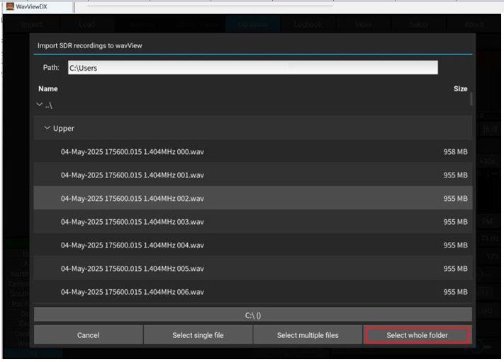 This is a backward-thinking approach based on the fact that WavViewDX can import files in “folders.” The golden rule is simply to store all files from a single session in a single folder. I’ve been using SDR Console as my primary SDR program for a while now, so when I register a scheduler (for timer scheduling), I click “Add date (yyyy-mm-dd) subfolder” under “Folder”, in Figure 6. This allows me to import the entire folder of recording files from that day into WavViewDX, saving me a lot of time. WavViewDX has a “Select Whole Folder” button, which allows me to import files into WavViewDX with a single click (Figure 7). How amazing! Incidentally, I set up bandwidth recording files to be stored in separate 1GB files. The moment I wake up, the files are instantly imported into WavViewDX, allowing me to quickly check the conditions from midnight to dawn before work.