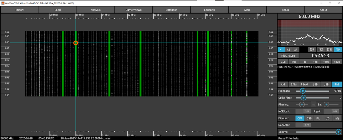 After recording bands using SDR’s such as Perseus or HF Discovery, I was informed by Kazu Gosui via email of a new program that’s “ultra” convenient for analyzing them. When monitoring in real time with Perseus, I have a general memory and notes of what was received at what time. However, when recording reception data without real-time monitoring, such as during nighttime hours, verifying and analyzing the data across all frequencies takes time. Knowledge and intuition about where to listen are also important elements. While all of this is a skill, I believe that previous tools have been unable to provide a comprehensive view of the day’s conditions. Since I started using WavViewDX, I’ve been using it every morning, efficiently analyzing the SDR recordings I’ve collected.