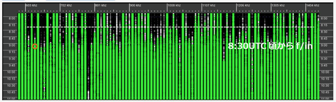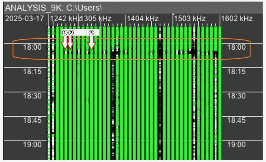 WaveViewDX already clearly shows the reception status on the vertical time axis, but just before the vernal equinox, a phenomenon in which the propagation conditions deteriorated simultaneously across multiple frequencies occurred, albeit for a short period of time. (Audio Sample https://youtu.be/XhXSQFiGQeo) What is this? Figure 9 shows the actual situation at my location on March 17, 2025, after 18:00 UTC.