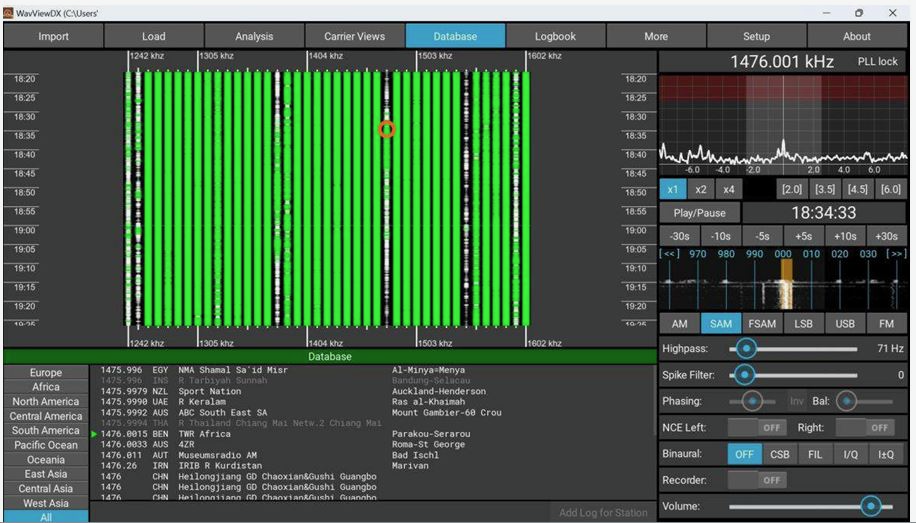 Then, one morning, right around 3:30 AM, on the morning of the March vernal equinox, I noticed a very clear bar on the 1476kHz using WavViewDX (Figure 8). By working in conjunction with WavViewDX, it automatically checks offsets in exact carrier frequency being received against the MWList database, and the > mark quickly lights up in WavViewDX, indicating that it’s TWR Africa! I was surprised when I heard the audio. I was impressed by the exceptionally clear reception. There was a slight beat, and it seemed like at least one other carrier was also in the mix. How such clear audio managed to reach and be heard across nearly 13,300 km as the crow flies is a mystery, but it’s still a moving experience.