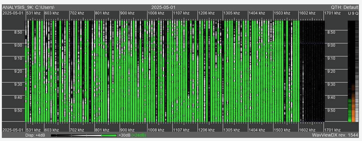 But first, a word about WavViewDX: seeing is believing. As shown in the sample image in Figure 5, it visually displays the status of stations received at each frequency, using green bars or white lines, in chronological order, from the lowest frequency band (left) to the highest (right). You can even customize it to analyze North and South America at 10 kHz intervals for TP reception.