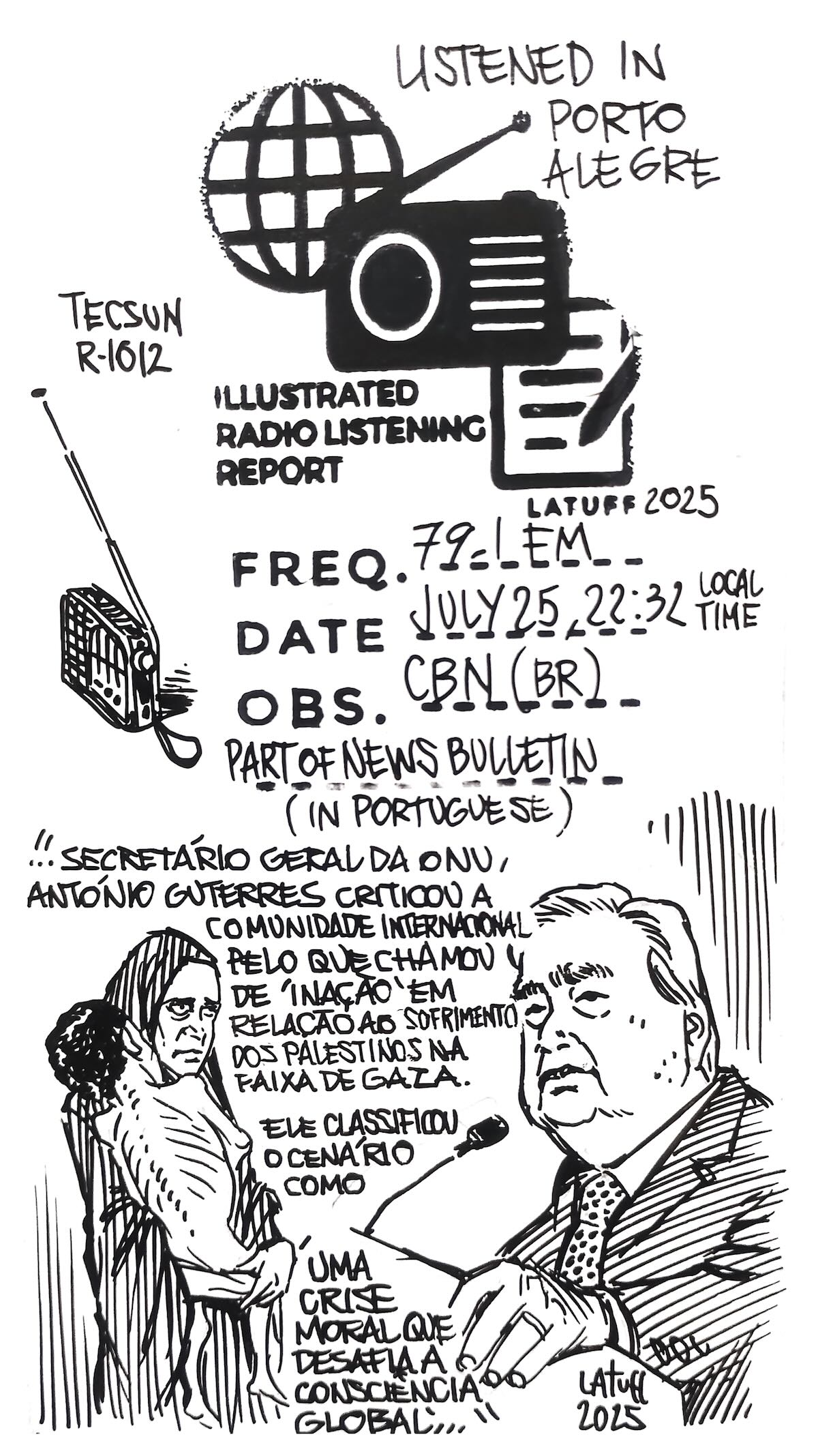 Many thanks to SWLing Post contributor and noted political cartoonist, Carlos Latuff, who shares the following illustrated radio listening report of recent CGTN, NHK, and Radio Taiwan International broadcasts.